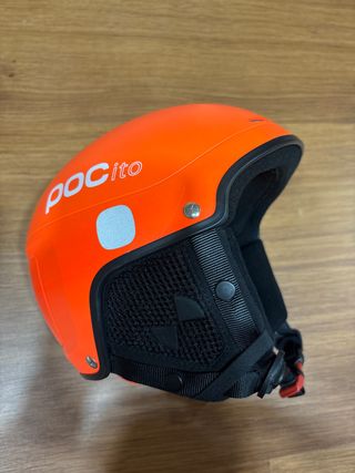 Casco de esquí o snowboard para niños de la marca POCito en color naranja brillante. Diseñado para ofrecer seguridad y visibilidad en la montaña. - Color naranja llamativo. - Detalles reflectantes para mayor visibilidad. - Acolchado interior para mayor comodidad. - Cierre de seguridad ajustable. Puedo acercarlo a Madrid por la zona norte y Odonell