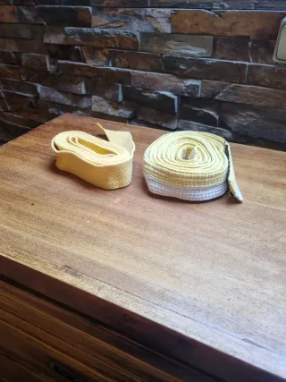 Dos cinturones de judo, uno amarillo y otro blanco con detalles amarillos. Perfectos para la práctica de artes marciales. - Material resistente. - Costuras reforzadas.