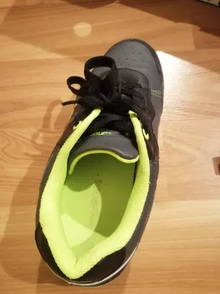 Zapatillas KangoRock con un diseño moderno y detalles llamativos. - Exterior en color gris oscuro. - Forro interior en color verde neón. - Cordones negros. - Suela con ruedas. *Falta la tapa de una de las ruedas. La zapatilla está en perfecto estado.