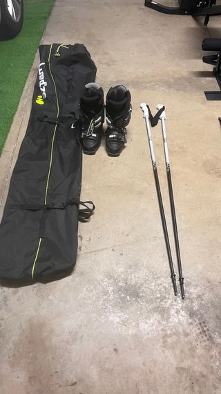 Conjunto de botas de esquí y palos. - Botas de esquí negras. Wedze - Palos de esquí blancos y negros. Atomic - Bolsa de transporte negra para esquí. Wedze