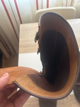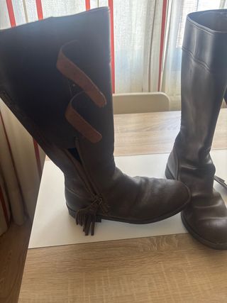 Botas de montar de cuero marrón, talla 41. Usadas solo tres veces. - Cierre con cremallera lateral. - Detalle de tiras en la parte superior. - Adorno de flecos en la cremallera.