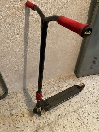 Patinete de estilo libre con manillar negro y puños rojos. - Base negra. - Ruedas con detalles azules. - Puños ODI rojos.