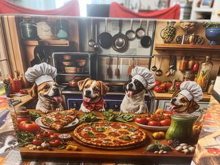 Puzzle de 1000 piezas con una divertida escena de perros cocineros preparando pizza en una cocina. - Ilustración detallada de perros con gorros de chef. - Escena de cocina con ingredientes para pizza. - Incluye una pizza completa y una porción. - Colores vibrantes y diseño atractivo. Perfecto estado, mas en mi perfil. Hago lotes de dos puzzles de 1000 piezas por 15€. Envio correos