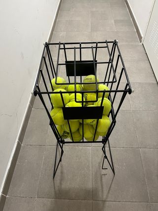Carrito metálico para transportar pelotas de pádel o tenis. Es resistente y fácil de mover. - Estructura de alambre negro. - Bandeja interior para organizar. - Ruedas para facilitar el desplazamiento. Las pelotas son de padel y se pueden utilizar para dar clases. El carrito no se ha usado nunca, esta nuevo. Cualquier cosa podéis preguntar sin problema