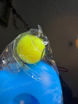 Dispositivo de entrenamiento para tenis o pádel. Incluye una pelota de tenis y una base. - Base de color azul. - Pelota de tenis amarilla. - Cuerda elástica para la pelota.