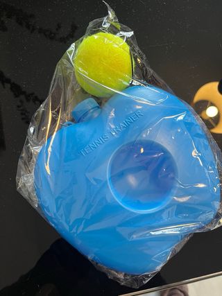Entrenador de tenis portátil en color azul, diseñado para practicar. Nuevo sin usar. - Base con tapa para rellenar con agua o arena. - Cuerda elástica negra. - Pelota de tenis amarilla.