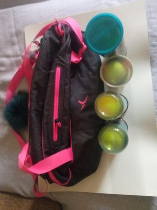 Bolsa de tenis con raqueta de aluminio y accesorios. Está en buen estado. - Incluye una raqueta de aluminio. - Bolsa de transporte con compartimentos. - Accesorios: 3 botes de pelotas y muñequera.