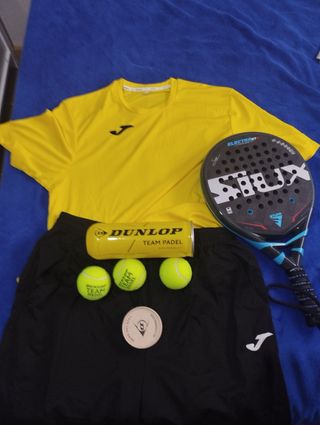 Vendo pala de pádel SIUX STUPA ELECTRA ST2 prácticamente nueva, con un pequeño roce que se ve en la foto. También 3 pelotas de pádel Dunlop con un un solo uso y un conjunto deportivo (camiseta y pantalón corto con bolsillos TALLA L) Joma, color amarillo y negro respectivamente. El conjunto está en perfecto estado. El motivo de la venta es que no puedo jugar porque me duele todo aunque si echáramos un partido seguro que te ganaba 😉 - Pala de pádel, pequeño roce, menos de 10 partidos. - 3 pelotas de pádel Dunlop. 1 uso - Conjunto Joma, talla L