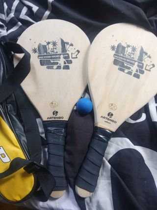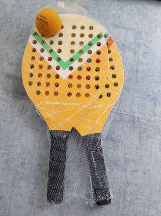 Set de ping pong que incluye raquetas y pelotas. - Dos raquetas de madera. - Cuatro pelotas de ping pong (dos naranjas y dos blancas). - La roja está un poco desgastada por qué se ha enganchado con el plástico por el calor, pero estar sin estrenar.