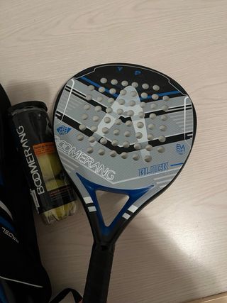 Set de pádel Boomerang que incluye pala, funda y tres pelotas. Nunca se han usado - Pala de pádel Boomerang. - Funda protectora para la pala. - Tres pelotas de pádel.