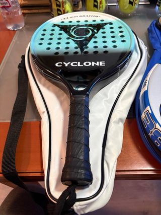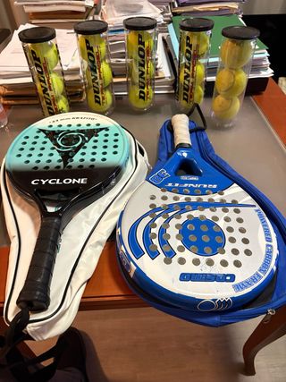 Se venden dos palas de pádel marca Cyclone y una pala marca Runfit Cosino 38 junto con un macuto Munich. Regalo 5 botes de pelotas. - Pala Cyclone con diseño en negro y turquesa. - Pala 38 con diseño en azul y blanco. - Macuto Munich.