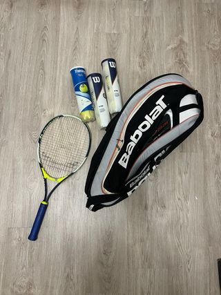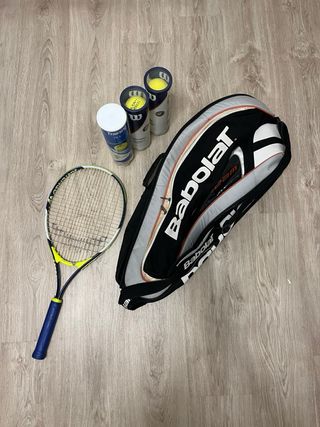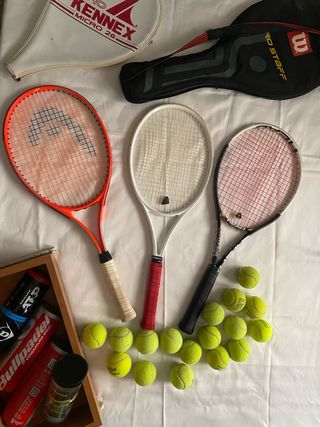 Vendo tres raquetas de tenis usadas, en buen estado. Ideales para principiantes o jugadores ocasionales. - Incluye 3 raquetas de diferentes marcas y modelos. - Se incluyen también varias pelotas de tenis usadas.