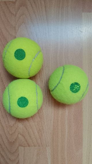 Tres bolas Dunlop Stage 1 de punto verde, usadas y en buen estado. Es ideal para niños y principiantes. Es un poco más lenta que una pelota de tenis normal.