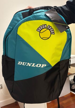 Mochila de pádel de la marca Dunlop con un diseño moderno y deportivo. - Colores: verde azulado, amarillo y negro. - Logo Urban Sport con una pelota de tenis. - Compartimento lateral de malla.