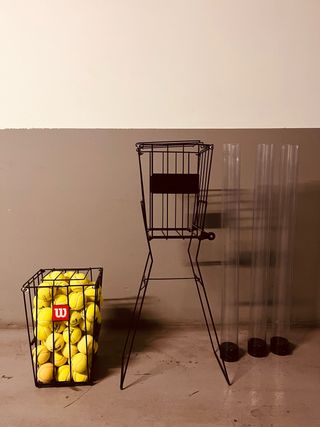 Conjunto de accesorios para la práctica del tenis, ideal para entrenamientos o clases. - Cesta negra para pelotas CON patas. - Cesta WILSON negra para pelotas SIN patas. - 3 Tubos transparentes para recoger pelotas.