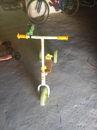 Patinete de tres ruedas para niños, con un divertido diseño. - Manillar con empuñaduras amarillas. - Figura de animal verde en el manillar. - Plataforma de madera. - Ruedas de color verde.