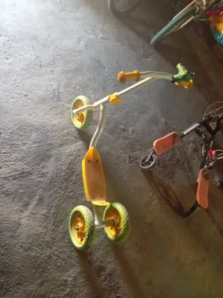 Patinete de tres ruedas con manillar negro y plataformas para los pies. - Manillar negro con puños. - Plataformas de color naranja con textura. - Estructura principal de color amarillo.