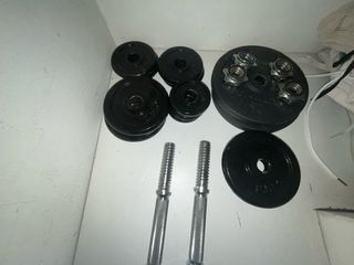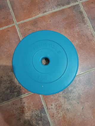 Se encuentra en Tenerife (sur). Solo recogida local. El envío es demasiado pesado. Juego de discos con una suma total de 24 kg: 4 x 2 kg 16 x 1 kg 1 barra 1,20 m y 28 mm de diámetro (6 kg) 2 barras de 35 cm y 28 mm de diámetro (2 kg c/u) Se pueden vender por separado