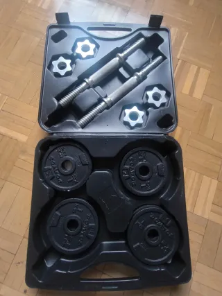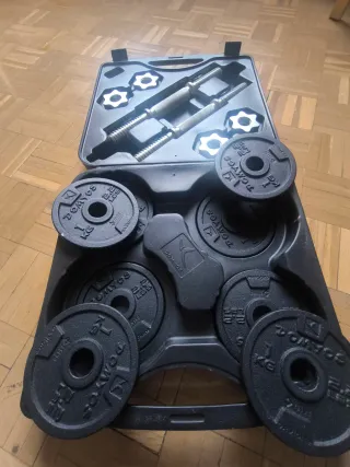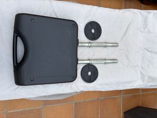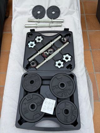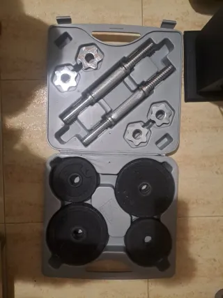 Precio no negociable Kit de pesas de 20 kg (44 lb) con maletín. - Incluye barras y discos. - Maletín de transporte. - Marca Decathlon. Usado 5 veces contadas Precio Nuevo 50€
