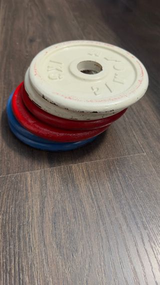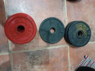 Conjunto de discos de hierro para equipar tu gimnasio en casa. - x2 Discos de 5 kg - x4 Discos de 1 kg - x4 Discos de 0.5 kg A recoger en Arguelles-Moncloa, Madrid