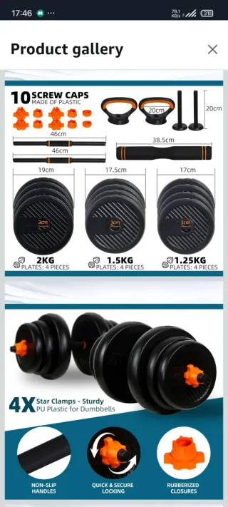 Kit de entrenamiento para gimnasio en casa. - Dos barras de mancuernas con mangos de goma + 1 sin goma - 10 Discos de pesas de 1 kg (plateados y rojo) - 4 Discos de pesas de 2 kg (rojos y gris oscuro) - 4 discos de pesa de 0,5 kg (gris). - Cierres de seguridad para las barras.