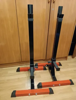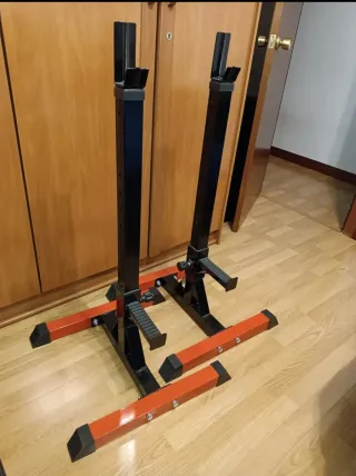 Banco de pesas plano para entrenamiento en casa. - Estructura robusta de metal. - Acolchado cómodo para el asiento. - Soportes para barra. Tapizado perfecto, algun desperfecto de pintura.