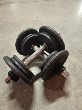 Par de mancuernas de 7 kilos ajustables con discos de peso. - Discos de metal. - Cierre de seguridad para los discos.