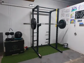 Banco de pesas para entrenamiento en casa. Ideal para rutinas de fuerza y tonificación. - Estructura metálica resistente. - Asiento y respaldo acolchados. - Barra es de las grandes con discos 20k incluidos.