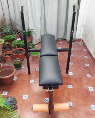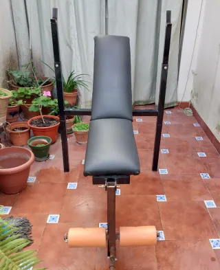 Banco de pesas de fabricación artesanal, ideal para entrenamientos en casa. Tiene varias regulaciones de altura y de inclinación. - Estructura metálica robusta y no desmontable. - Asiento y respaldo acolchados con sky. - Soportes para piernas. Precio algo negociable. Se vende por no usarla actualmente.