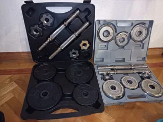 2 Kit de mancuernas, de 20 kilos del decathlon, y otro maletín cromado, de 15 kilos - Incluye dos barras de mancuerna. - Variedad de discos de peso. - Cierres de seguridad para los discos.