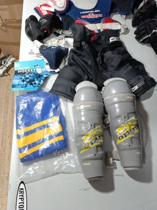Conjunto de equipación de hockey para junior. 135/145cm y peso 30 o 35 kilos - Pantalón de 0€ - Espinilleras. 15€ - Camiseta 12€ - Guantes 0€ Peto 0€ Coquilla 6€ Medias 7€ -