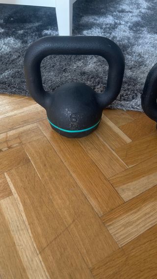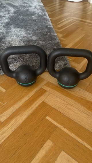Kettlebell de 6 kg y dos de 4 kg con acabado en negro mate. Cuenta con una banda de color turquesa que indica el peso. - Peso: 6 kg/ 4 kg - Color: Negro - Banda decorativa turquesa 15€ la de 6kg y 8 cada una de las de 4kg.