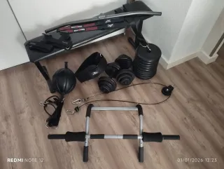 Equipo de gimnasio completo para entrenar en casa. - Banco de pesas ajustable. - Barra con discos. vendida - Mancuernas. - Accesorios para ejercicios de piernas. - Barra Z - Hay sobre unos 15 kilos en discos Preguntad precio