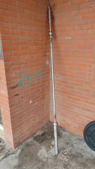 Set de barra y pesas para entrenamiento en casa. Ideal para rutinas de fuerza. 15 pesas de unos 16 kilos en total. barra: 1,60 cm - Barra metálica. - Pesas de goma negra.
