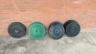 Discos de pesa para entrenamiento. - Diámetro de 30mm. 2 de 10 kg 2 de 7'5 kg 4 de 5 kg 4 de 3 kg 4 de 2 kg 2 de 1'5 kg 2 de 1'25 kg 4 de 1 kg En total 84,5 kilos