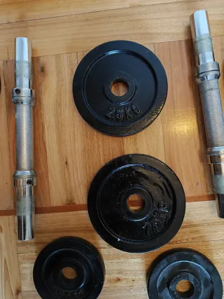 Set de mancuernas ajustables con discos de peso. - Dos barras de mancuerna con agarre texturizado. - Discos de peso de 2.5 kg (4 unidades). - Discos de peso de 1,25 kg (4 unidades). - Cierres de rosca para asegurar los discos. Total de 15 kilos más lo que pesen las barras.