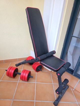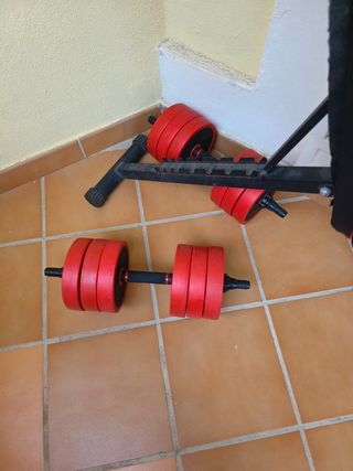 Se vende por no utilizar son 20 kilos por mancuernas como peso maximo 5 como minimo y tambien se vende el banco. Las mancuernas se pueden unir