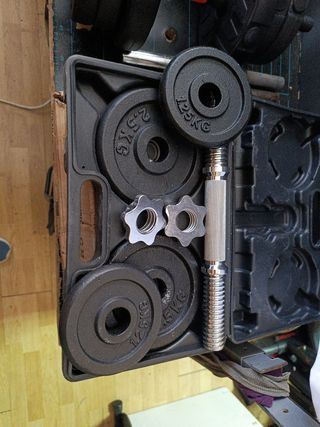 Se vende lote de mancuernas de 9,5kg cada una, en muy buen estado. Incluye: 4 discos de 2kg 4 discos de 1,5kg 4 discos de 1,25kg 2 barras de mancuernas con cierres Barra empalme para barra larga. Palabras clave: gimnasio, gym, domyos, decathlon, pesa, pesa rusa, kettlebel, mancuerna, disco, peso, halterofilia, barra, cierre, pinza, barra, dominadas, gervasport, tentable, 25mm, 28mm, 30mm, barra romana, barra h, barra z, zeta, banco, press, banca, bodypump, 1kg, 2kg, 5kg, 10kg, 20kg, olímpica.