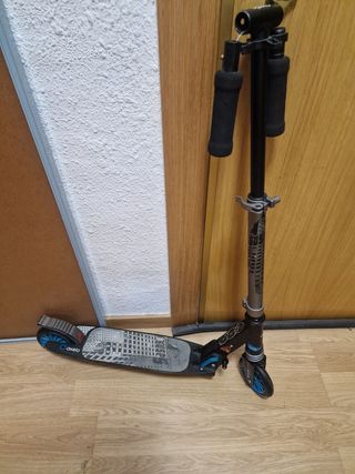 Patinete Oxelo Mid 9 de Decathlon, en buen estado. - Modelo: Oxelo Mid 9 - Marca: Decathlon - Color: Gris y azul Está diseñado para jóvenes de 9 a 14 años, con una altura de entre 1,25 y 1,75 m y un peso máximo de 100 kg.