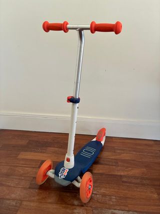 Patinete infantil de 3 ruedas con luces que ofrece una estabilidad excelente, evitando caídas innecesarias mientras👦👧 aprende a coordinar. Fácil manejo: Sistema de giro intuitivo por inclinación. Usado pero en muy buen funcionamiento. Las ruedas giran perfectamente y los puños están íntegros. Azul con detalles en naranja vibrante y blanco. Modelo B1 500 Oxleo de Decathlon. Peso máximo 50kg. Manillar ajustable en altura. Ruedas con luces LED que se activan al rodar. Plataforma antideslizante para mayor agarre. Freno trasero para una parada segura. Se puede recoger en persona zona cercana al metro🚇Ⓜ️ Puerta del Ángel - Madrid.