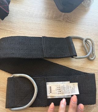Cinturón de entrenamiento Pull-up para pesas con el logo de Domyos, Decathlon. Para engancharle cadena y pesas. No encuentro la cadena, de ahí su precio. Lo tengo guardado, se ha utilizado tres veces contadas. - Tejido de nylon resistente. - Cierre ajustable.