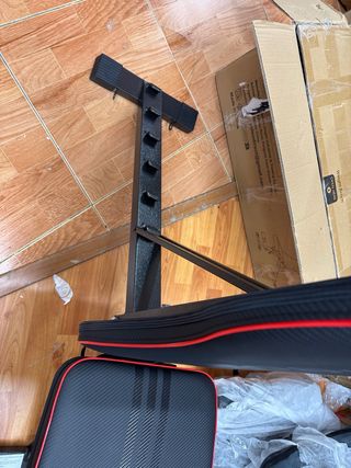 Banco de pesas con diseño moderno y funcional. Perfecto para tu rutina de ejercicios en casa. - Tapicería negra con ribete rojo. - Estructura metálica negra. - Patas antideslizantes.