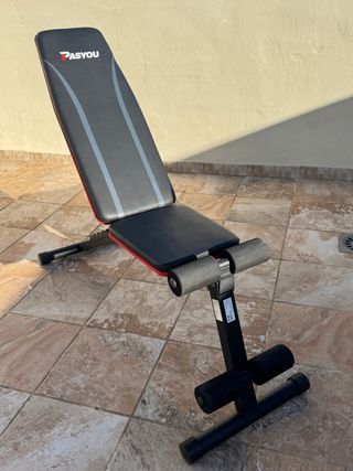 Banco de pesas multifuncional, ideal para entrenamientos en casa. Su diseño permite una gran variedad de ejercicios. - Estructura robusta de metal. - Asiento y respaldo acolchados. - Ajustable en altura y posición.