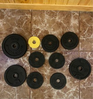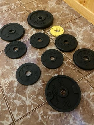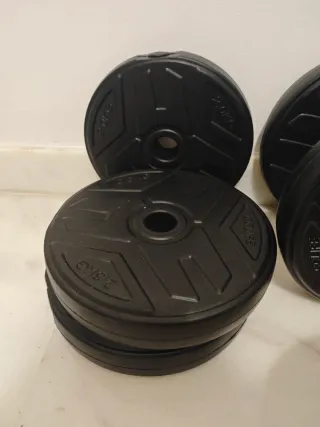 Set de pesas y mancuernas para entrenamiento en casa o gimnasio. Incluye 16 discos de peso negros, 2 barras con agarre ergonómico y 4 cierres de seguridad para discos. El producto está como nuevo, prácticamente sin uso. Lo vendo porque me he apuntado al gym. El peso de los discos se distribuye en: - 4 de 1.25 kg - 4 de 1.5 kg - 4 de 2 kg - 4 de 2.5 kg Peso total: 30 kg. Entrega en mano o envío sólo por Correos