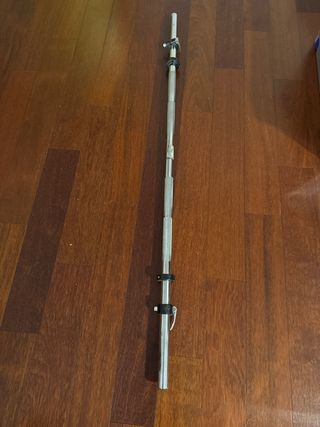 Barra de pesas de la marca Decathlon. Es un accesorio de entrenamiento versátil. - Material: Metal cromado. - Longitud: 163 cm.