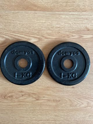 Par de discos de pesas de la marca Domyos. - Peso: 1 KG cada disco. - Color: Negro. - Material: Hierro fundido.