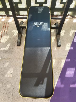 Banco de pesas marca Everlast, ideal para entrenar en casa. Con más pesas aparte - Estructura metálica. - Tapicería negra con ribete amarillo.