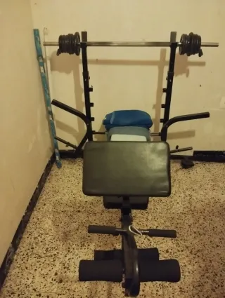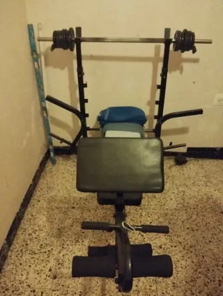 Equipo de gimnasio para entrenar en casa. - Banco de pesas. - Barra. - Mancuernas. - Discos de pesas. 8 discos de 5kg 4 discos de 2.5kg 4 discos de 1.25kg 3 discos de 1kg