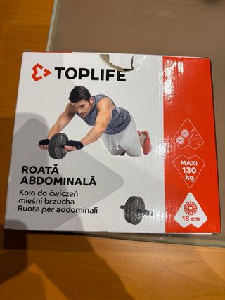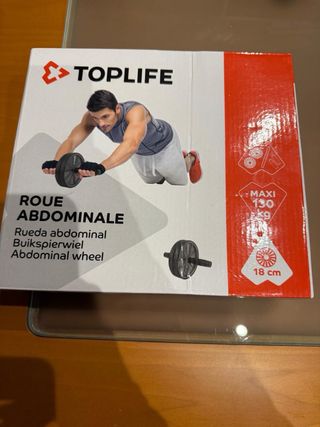 Rueda para ejercicios abdominales de la marca TOPLIFE. Soporta hasta 130 kg y tiene un diámetro de 18 cm. - Nueva, sin utilizar. - Marca: TOPLIFE - Peso máximo soportado: 130 kg - Diámetro: 18 cm