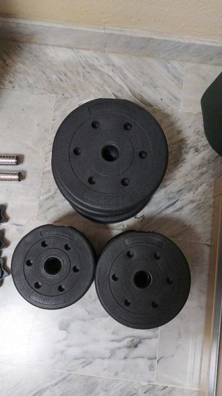 Conjunto de pesas ajustables, ideal para entrenamientos en casa. - Incluye 2 barras para mancuernas, una barra extensora para conectarlas y discos de peso (4x1kg 4x1'25kg y 4x2'5kg). - 5 Cierres de rosca para asegurar los discos. Precio negociable/Posibilidad de venta por partes/Posibilidad de envío